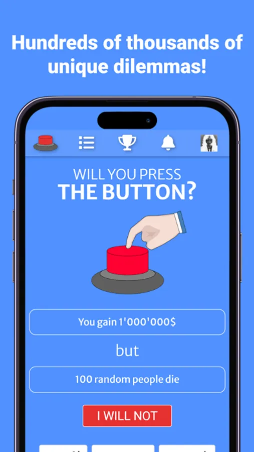 • The dilemmas are designed to be thought-provoking and challenging. They will make you question your own values and beliefs. Will you press the button and become a millionaire, even if it means losing your loved ones? Will you become famous, even if it means losing your privacy?