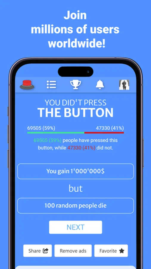 Will You Press The Button? is the ultimate game for testing your ethics, logic, and sense of humor. Download it now and join millions of players who have already Pressed The Button!