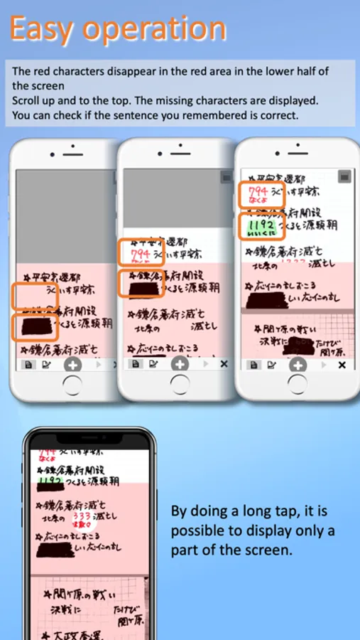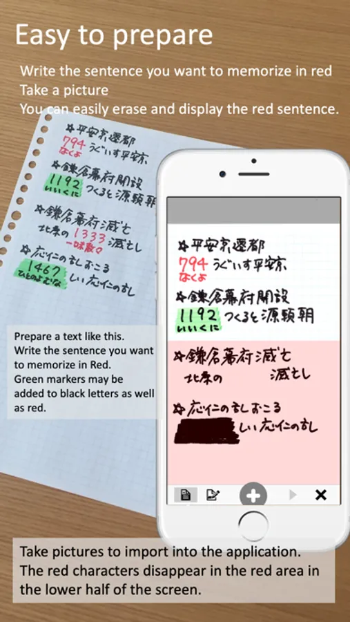 For this reason, characters written in red color or check marker of green in the reference book can be hidden by just taking a photo. In other words, things have been learned by using the memorization sheet are now available on your device. It's also possible to convert the whole reference book into PDF and capture it.
