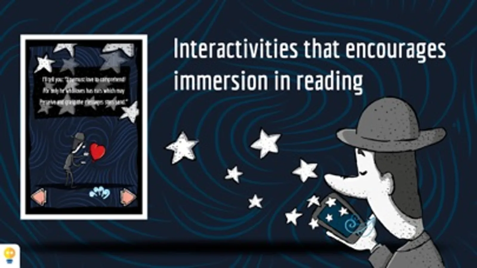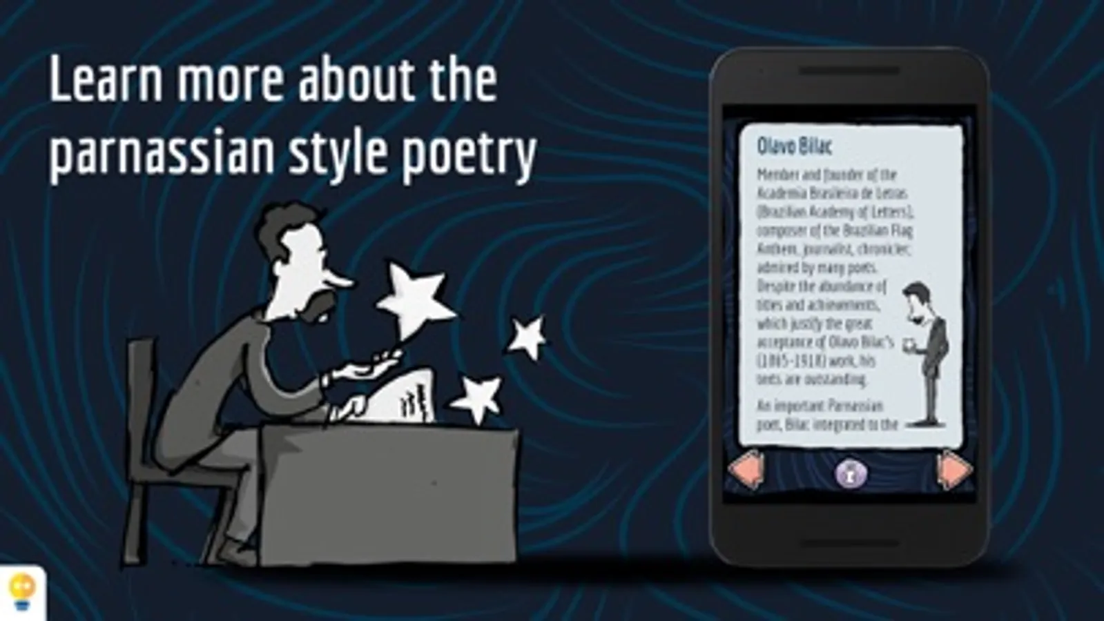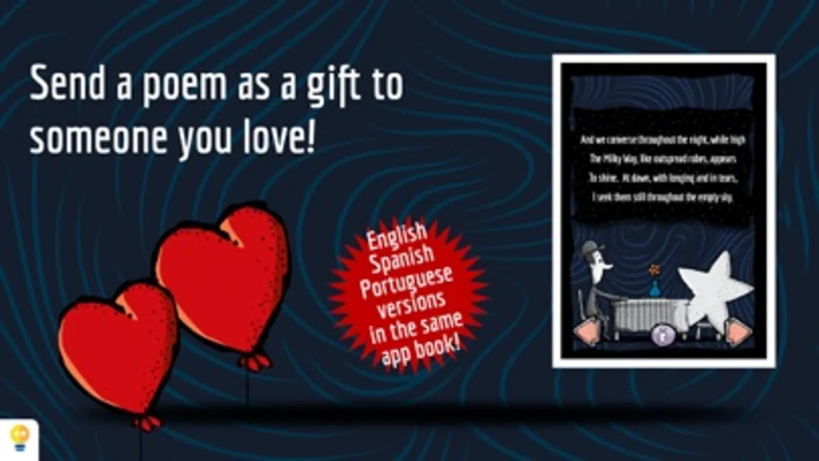 In Milky Way, the reader can reaffirm or discover the taste for the poem as a literary genre, by involving itself with the words, sounds and subtle poetic interactivities, like opening windows moving the stars with your breath, touch and hear the stars, and float alongside them in a bright night. The extras talk about the life of Olavo Bilac and present a summary on the parnassianism.