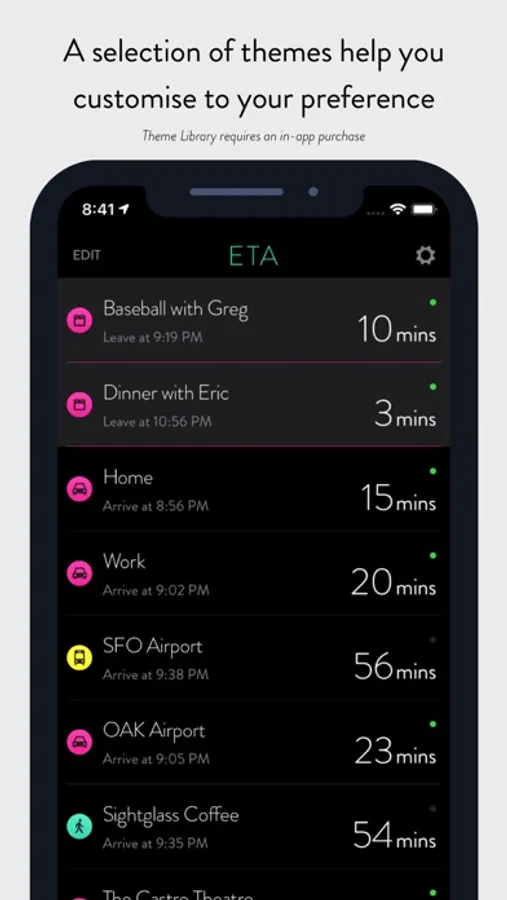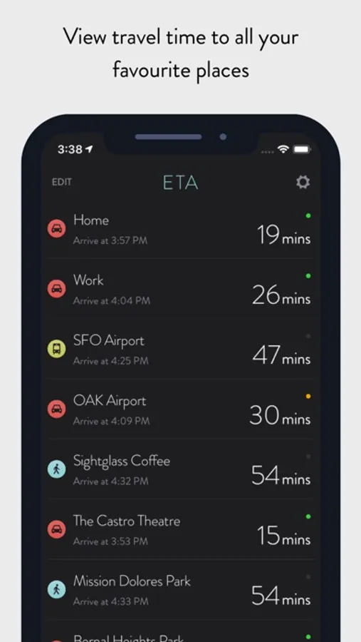 Driving times to your locations are conveniently presented on a single screen with an indication of current traffic alongside. In a tap you're delivered pre-routed, turn-by-turn driving directions in your favourite navigation app. ETA works with Apple Maps, Google Maps, Waze, HERE Maps, CityMapper, Transit, TomTom and more.