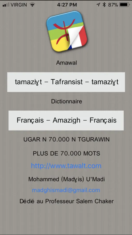 Cette application, simple et pratique est destinée non seulement aux amazighophones mais à tous ceux et celles qui s’intéressent à la langue Amazigh. Elle est développée spécialement pour vous donner accès à plus de 700000 mots en tamazight et leur équivalents en français puisés essentiellement à partir des lexiques de référence comme l’Amawal de M. Mammeri, le Dallet, le dictionnaire universel bilingue: Tamazight - Français, Ccix-iw, etc.