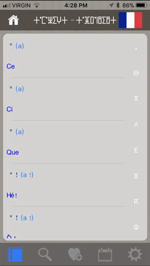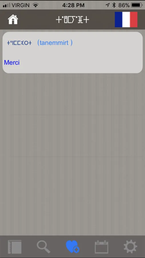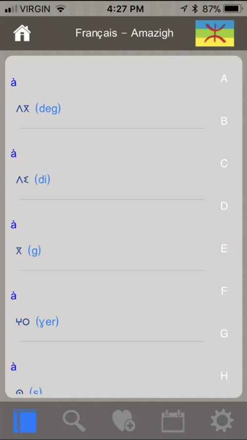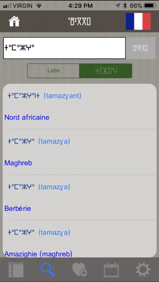 Son interface esthétique vous permet de naviguer d’une langue à l’autre très facilement, de choisir la graphie amazigh qui vous convient à savoir la graphie latine ou le Tifinagh. Des options intégrées comme l’option de partage, vous permettent d’envoyer des mots et leur équivalent à vos ami(e)s via les réseaux sociaux comme Skype, Facebook, etc. et d’enrichir votre vocabulaire en tamazight.
