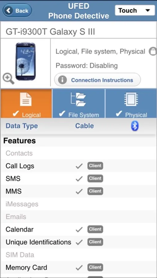 The UFED Phone Detective mobile app is a fast, easy way to view forensic extraction and decoding capabilities, as well as connectivity methods, for any mobile device profile supported by UFED 4PC/Touch/Classic.