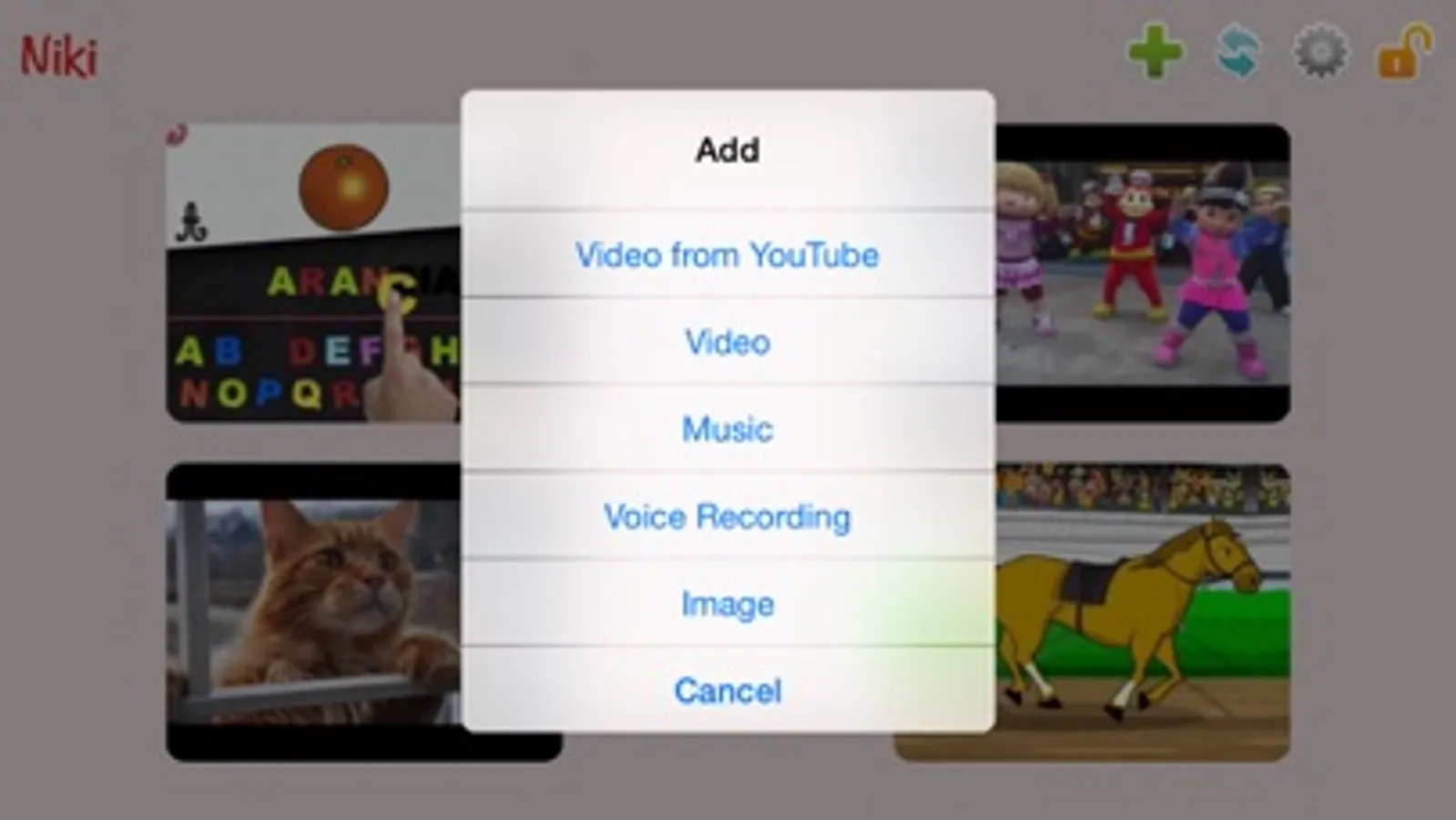 Niki Play allows kids to enjoy their favorite videos and music independently. Parents can import videos from YouTube or the camera roll, pick songs from the music library or record their own voice. Kids just touch and play safely.
