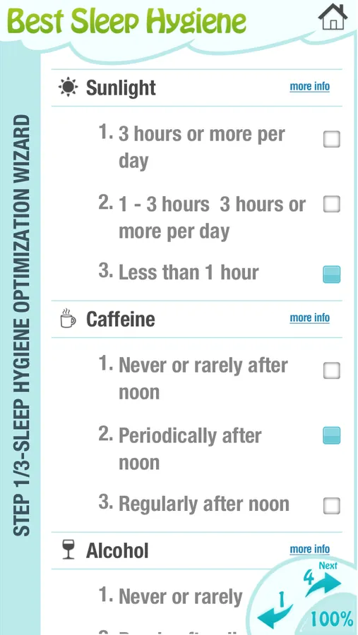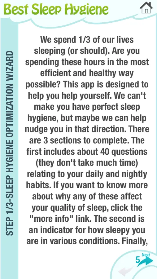 The first includes about 40 questions (they don’t take much time) relating to your daily and nightly habits. If you want to know more about why any of these affect your quality of sleep, click the “more info” link that accompanies each question. Should you want more detailed information, including recent research, you will be given that option as well.