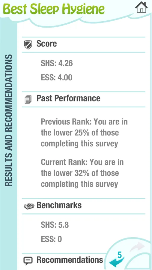 You can save your scores to allow comparisons over time. This allows you to continually work to improve your sleep hygiene. If you work on improving your score and come back regularly to see how you have improved (and see how you compare to others), we feel you will improve your health through better sleep.