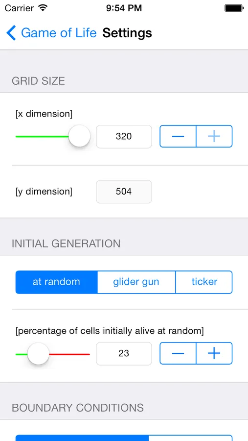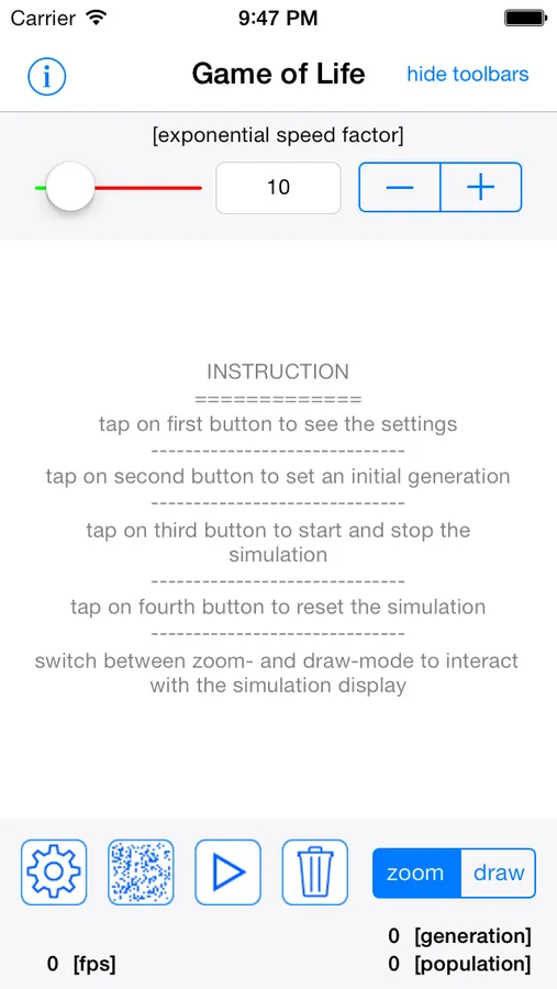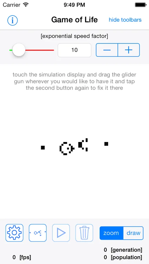 * set simulation speed between 0x (next generation manual) and 100x and change the value during runtime