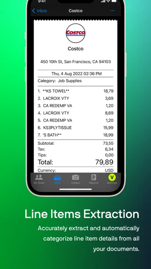 Veryfi extracts vendor, payment, totals, taxes and even line items in seconds. Veryfi is SOC2 Type2 certified and compliant with CCPA, HIPAA, GDPR.