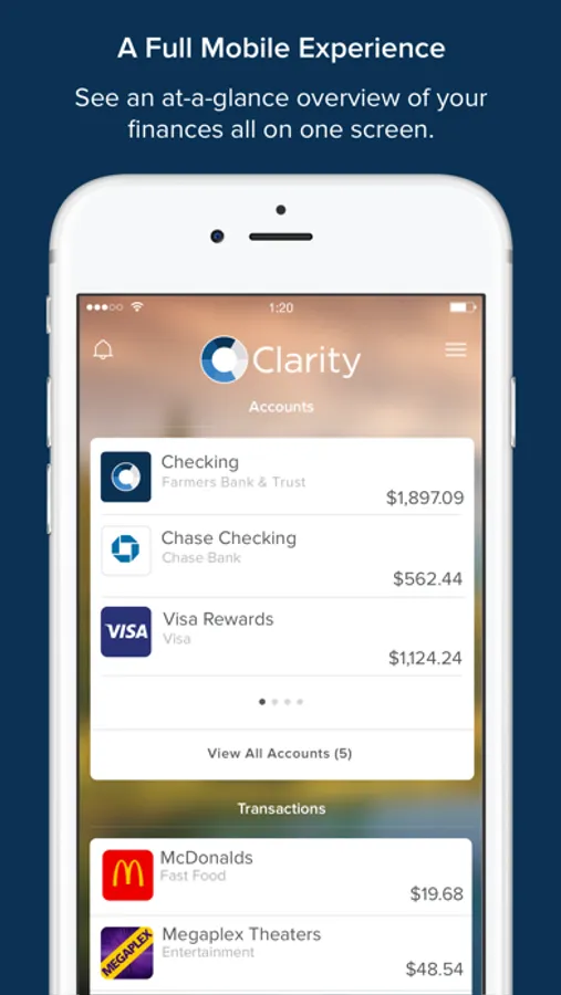 Clarity’s award winning design makes managing money not only easier and more convenient - but a lot more enjoyable and exciting as well. Not only will you be able to see all your financial data in one place, you will be able to visualize that data in meaningful and engaging ways on your phone or tablet.