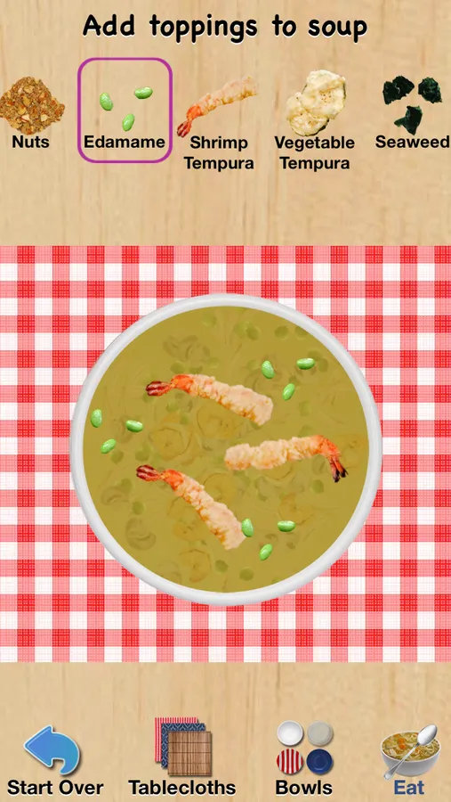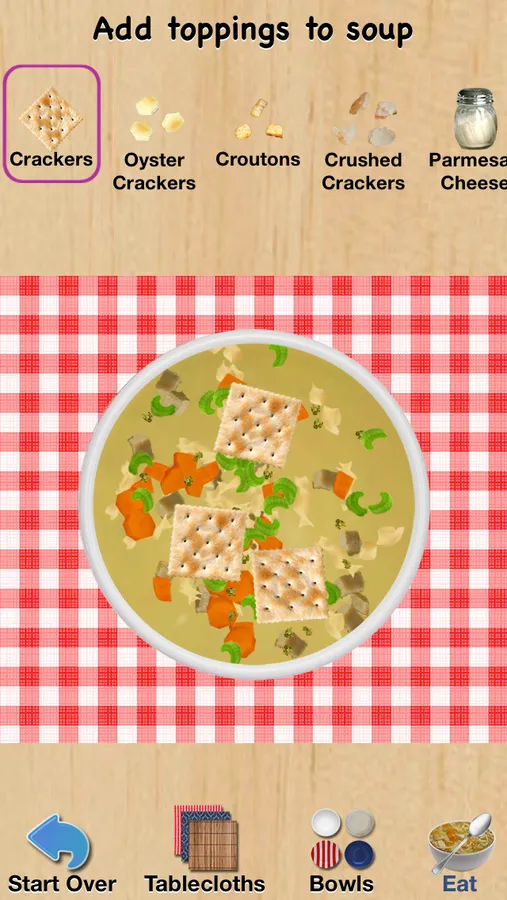 Choose the right bowl & tablecloth and then tap to take bites. You can even share your soup with friends via email or Facebook.