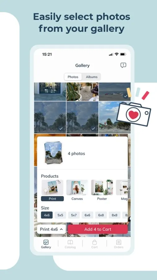 2. Select the size & quantity of each photo, or create custom magnets, cards, posters or canvas prints