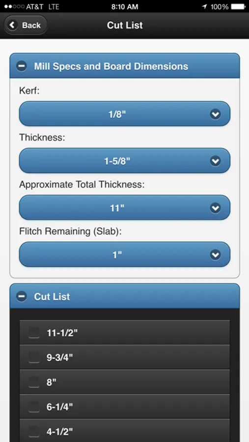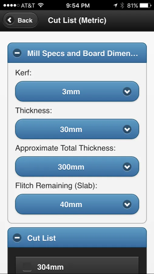 1. Generation of a list of cuts to make the desired boards accounting for blade kerf. As cuts are made, they can be checked off in the app.