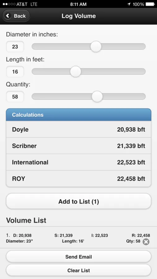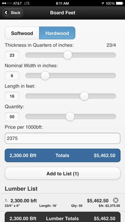 2. Calculation of board feet where lists can be saved and emailed as a table. Hardwoods and softwoods are supported.