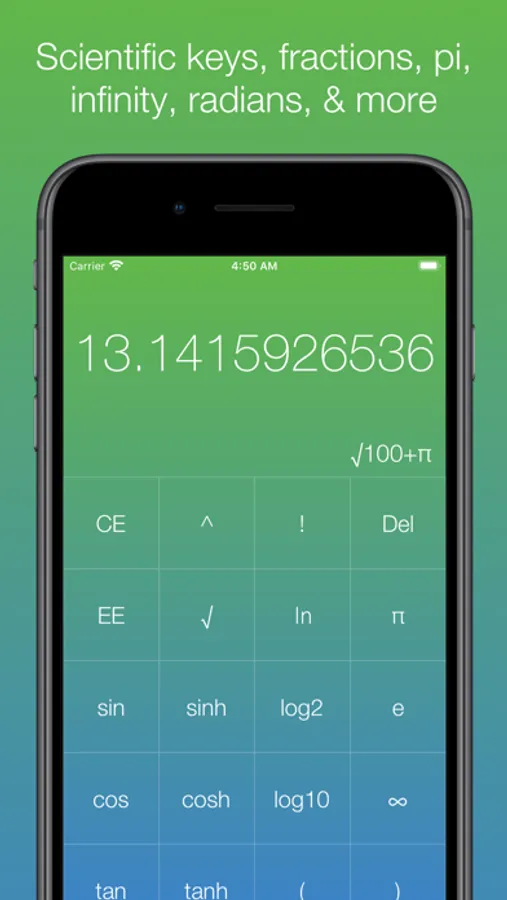 - Full scientific keypad including sin/cos/tan, EE, ln, log, square root and more!