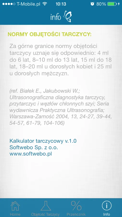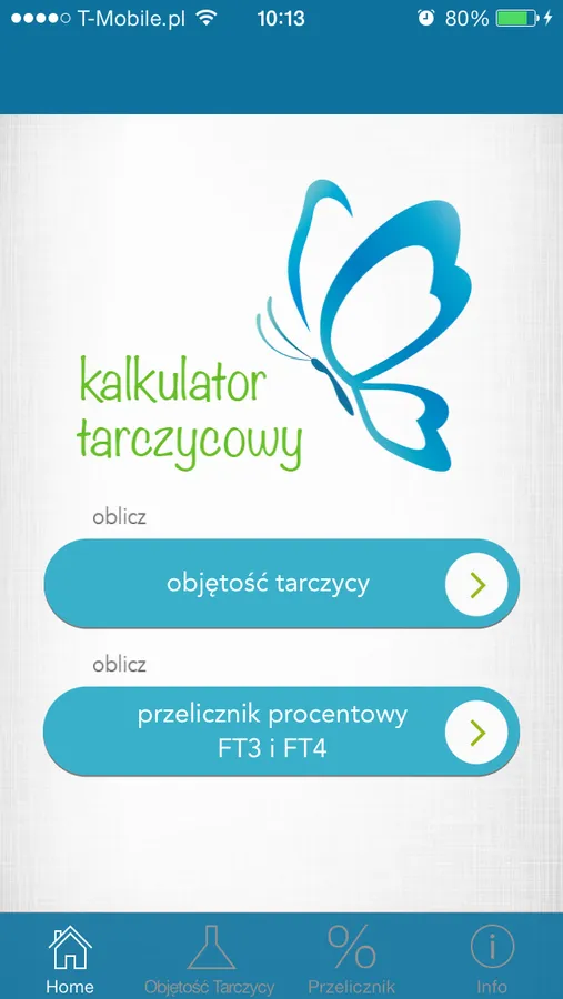 Aplikacja z kalkulatorami dzięki której szybko obliczysz objętość tarczycy oraz przeliczysz wyniki hormonów ft3 i ft4 na procenty. Sprawdź czy Twoja tarczyca ma prawidłową objętość.