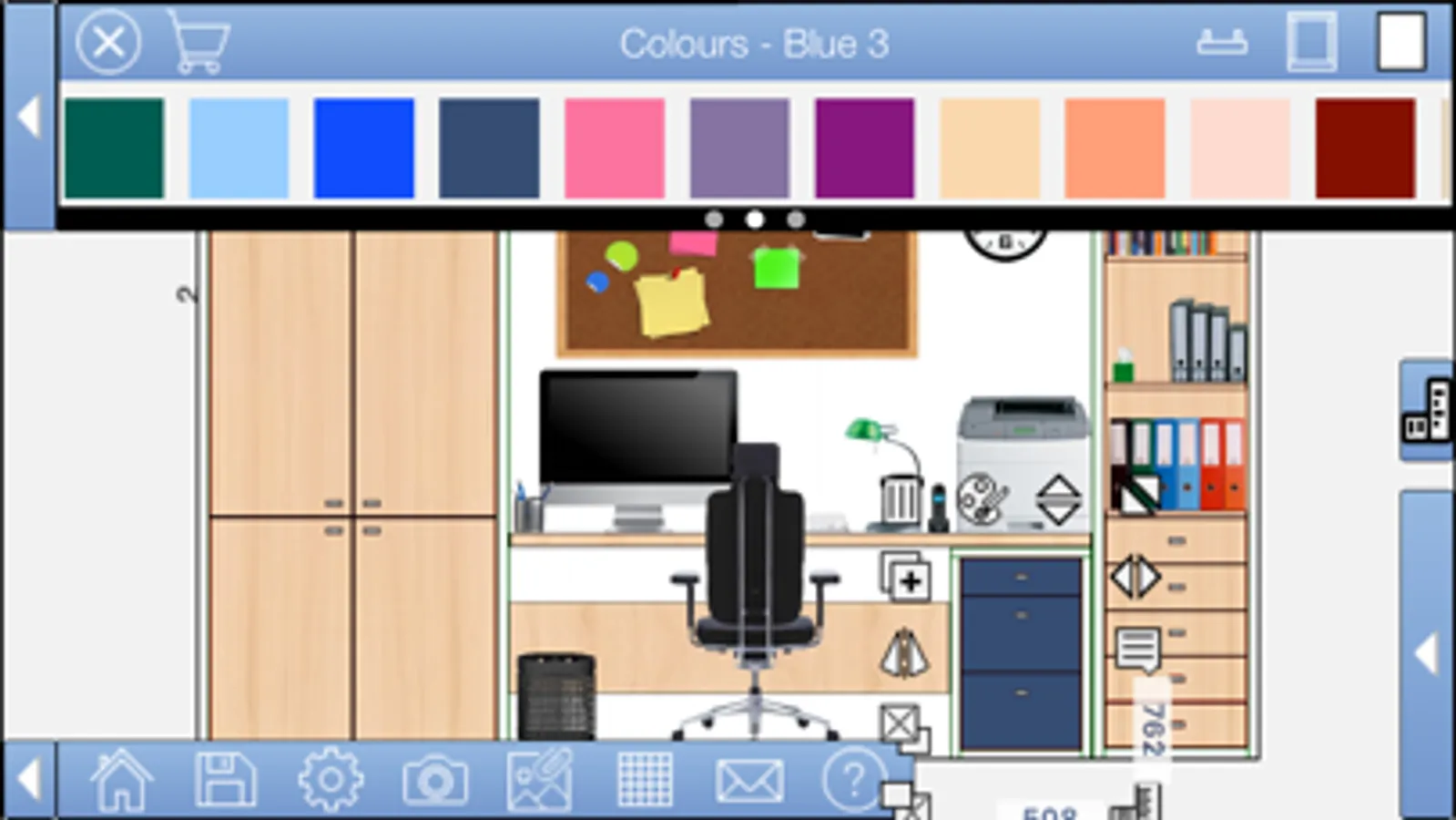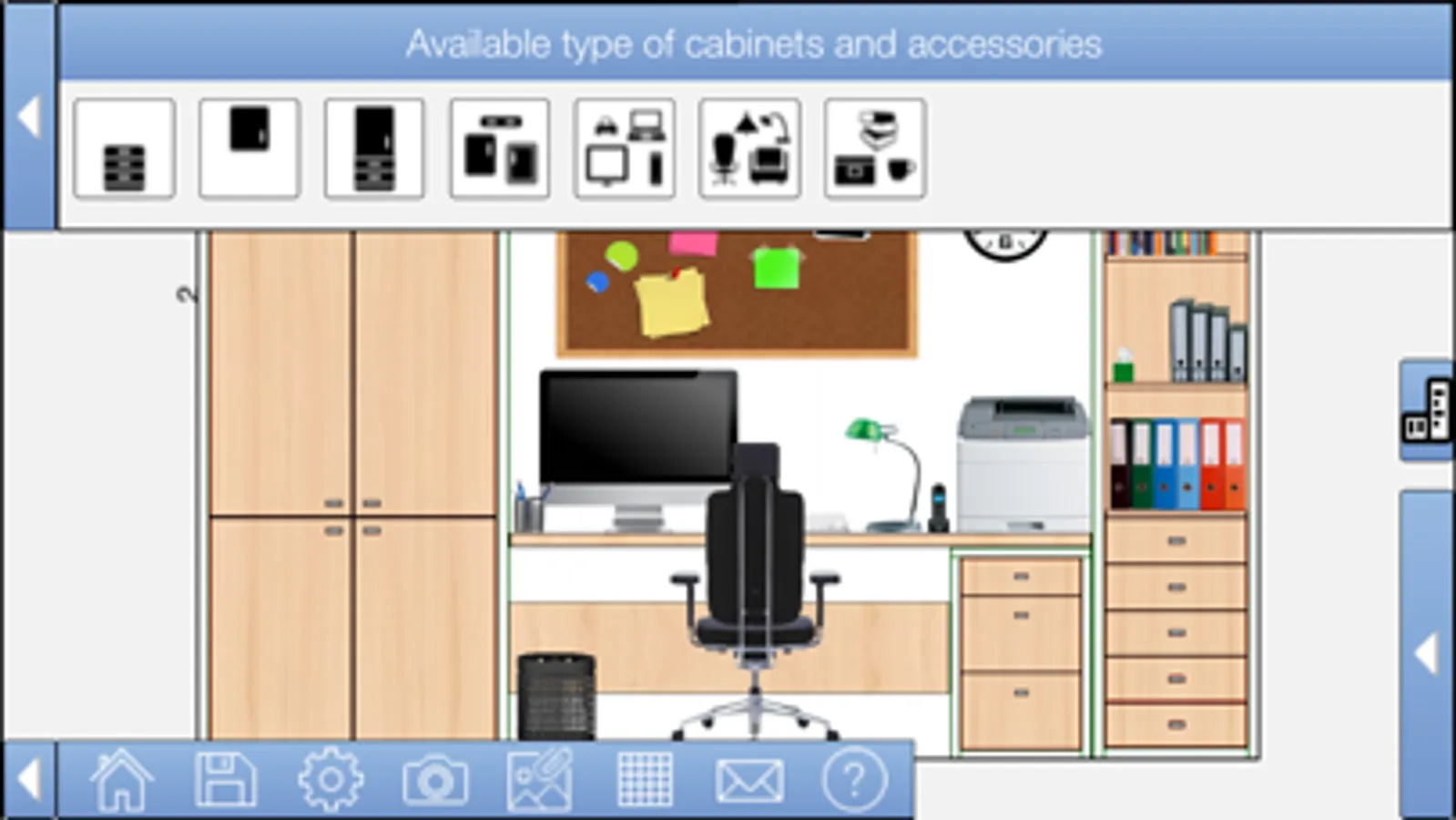 Design a office with your iPad, iPhone or iPod, inserting items in the front view of each one of the room walls. Insert cabinets, furniture and accessories. Select materials and finishes among woods, colors and accessories. Save your designs in your device or email them in ".pdf", ".png", ".jpg" or ".dxf" format.