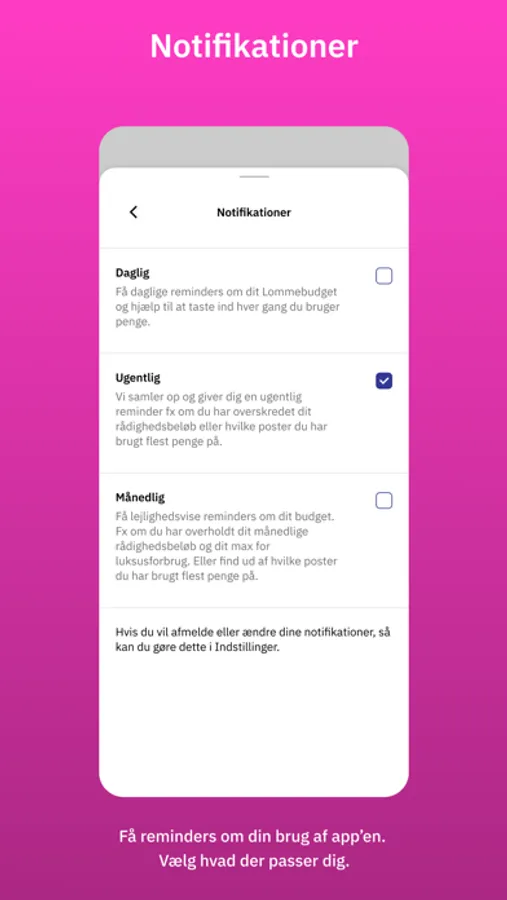 • Få daglige, ugentlige eller månedlige reminders om din brug af app’en hvis du ønsker det