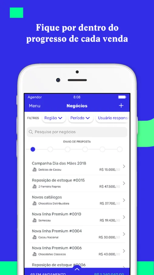 • Organiza suas negociações em um Funil de Vendas visual, que te dá uma visão panorâmica do seu processo comercial.