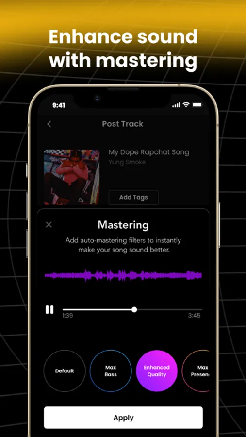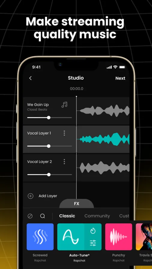 The Rapchat platform gives you unlimited access to over 300,000+ instrumentals and beats uploaded from producers around the world. With our easy-to-use recording studio, you can record your vocals with effects like Auto-Tune®. Then auto-master your track using AI to instantly give you a studio-quality sound. Save your lyrics using the in-app notepad so you can capture inspiration on the go.