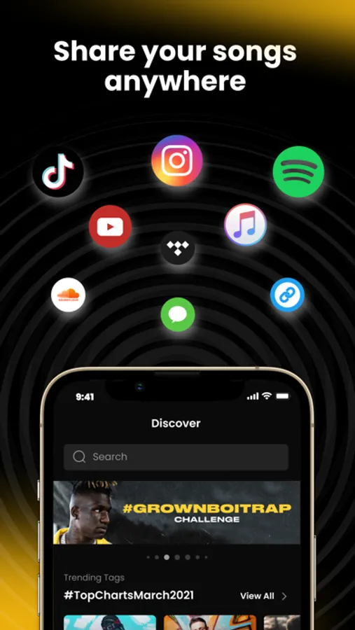 Once you finish your masterpiece, you can easily share it on Instagram, TikTok, Snapchat, Soundcloud, and more. Plus, we have a massive community on the app as well and constantly run challenges with top artists like MGK and Meek Mill.