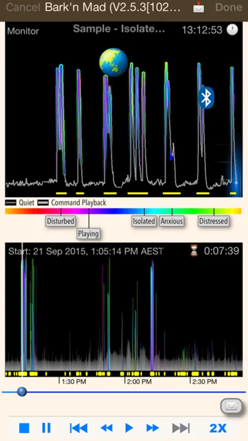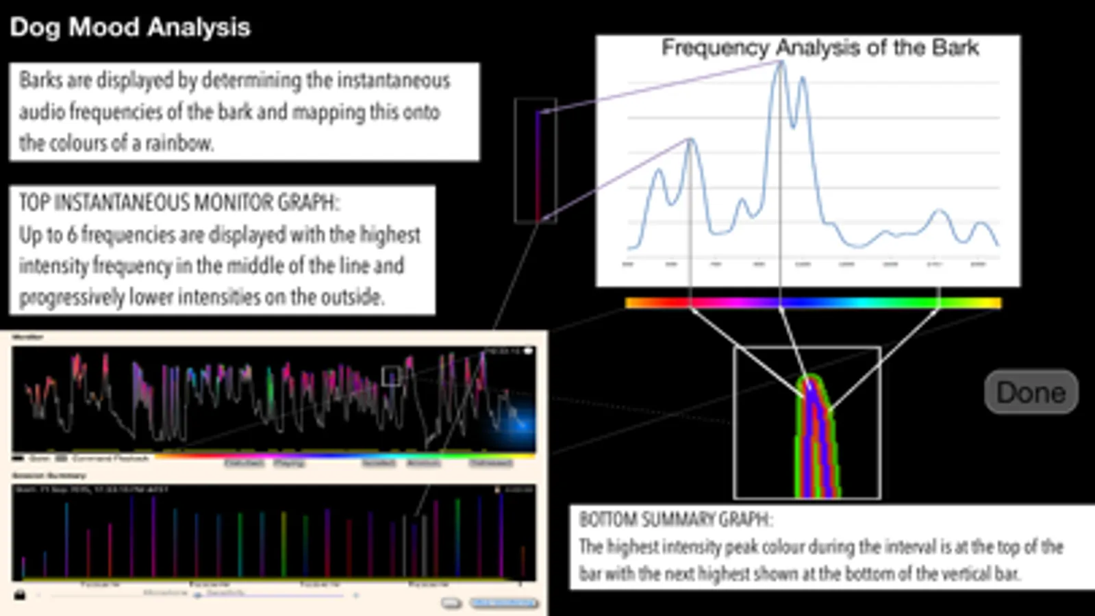 Was your dog disturbed? Was it lonely? Was it playing? See why your dog is barking with color analysis graphs which show the dog’s mood from the sounds in the bark.