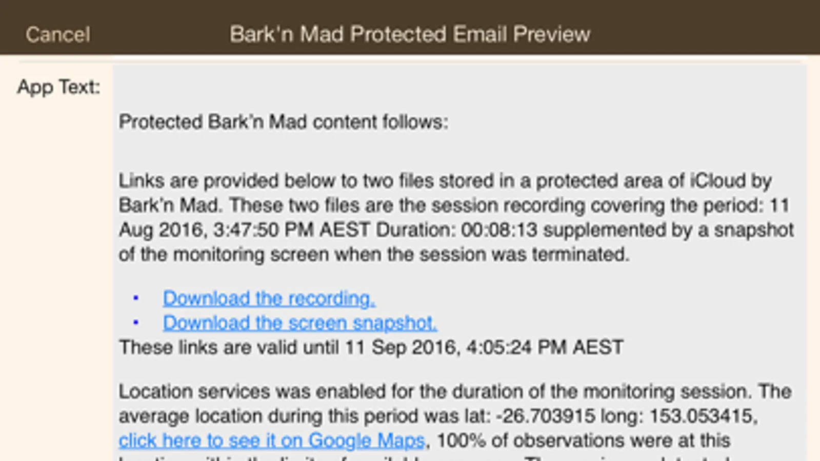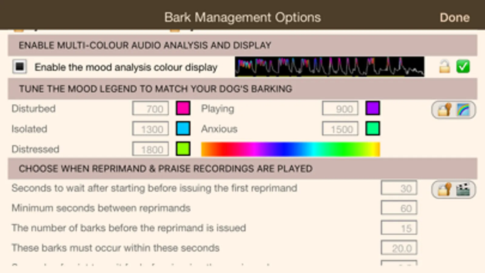 We recently got a rescue dog not used to having his own 'pack' and certainly not to being left alone. We were concerned he might be barking and that this would annoy or worry neighbours. We tried this app for the first time today and it worked perfectly! After an hour in, he started whining and barking a little, enough for the '20 second' criteria to be reached and the prerecorded 'quiet' message to be played. To my amazement listening to the recording afterward, he quietened down, was rewarded with the 'praise' I had recorded, and was quiet for the rest of the time we were out! Just amazing.