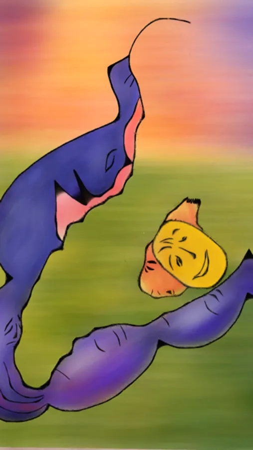 One example is the painting "On Trial" where anger is evident in the faces and pointing fingers of the characters and the moon looking down at the scene has a single tear. When viewed through Leighton's augmented reality app, the painting catches fire and the only way to put out the fire is to tap on the moon which begins to cry therefore putting out the flames with the tears. This piece is about anger in the form of blame and judgment, and shows how when feelings are expressed, anger subsides.