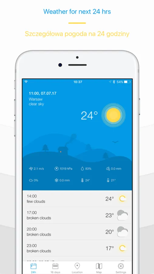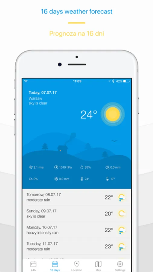 Weather Forecast 16 days is a free application where you can find current weather forecast. With the application you can check the current and forecasted temperature, precipitation, humidity, atmospheric pressure and cloudiness. The real-time application shows detailed twenty-four-hour and six-day weather forecasts: