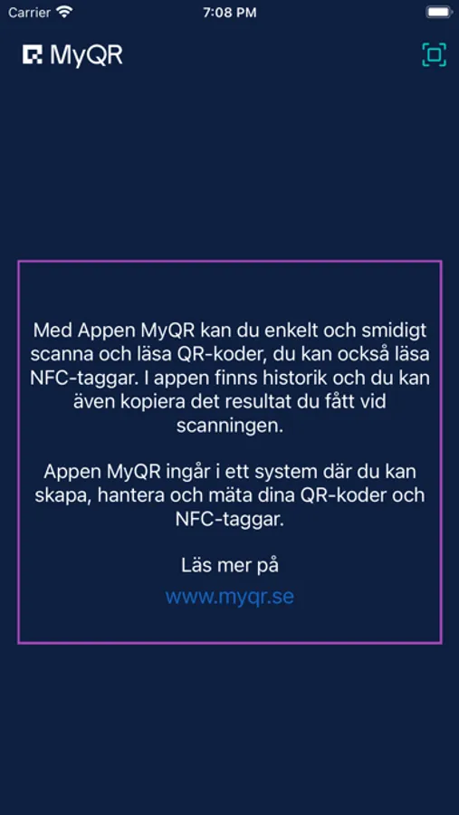 Med Appen MyQR kan du enkelt och smidigt scanna och läsa QR-koder, du kan också läsa NFC-taggar. I appen finns historik och du kan även kopiera det resultat du fått vid scanningen.
