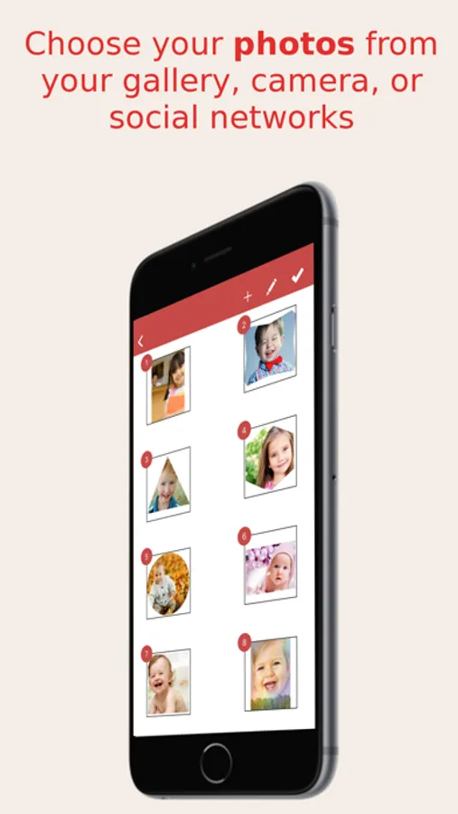 You can use photos from your gallery, camera, or social networks like Facebook or Instagram. Add a title with awesome fonts, and then render a video in medium or high-quality.