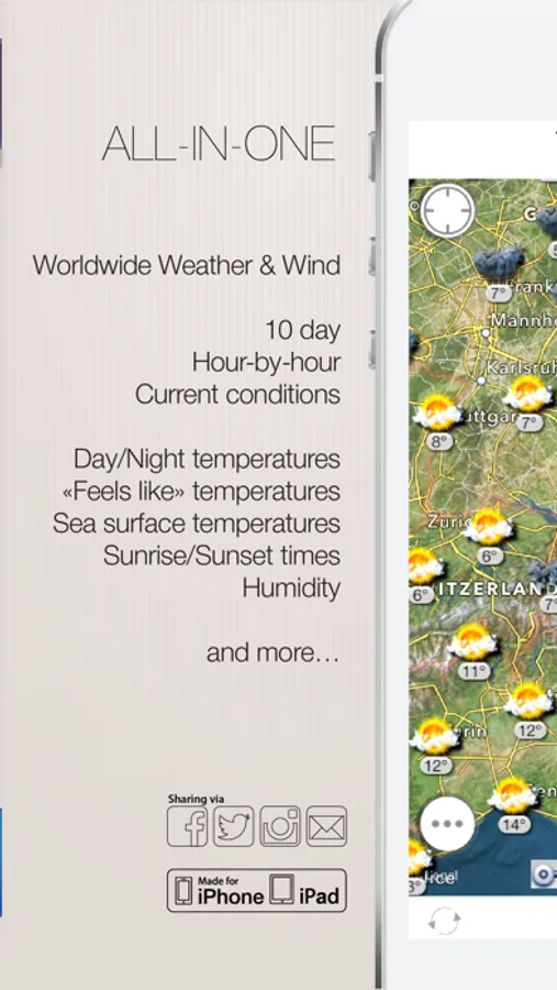 • Current weather conditions and temperatures on top of the interactive maps