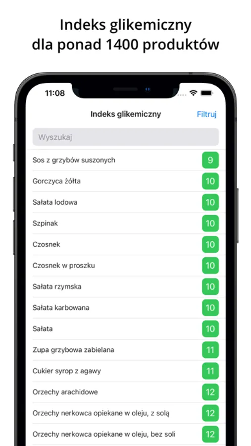 Aplikacja zawiera bazę ponad 1400 produktów, którą dzięki kolorowym oznaczeniom można łatwo przeszukiwać i sortować, a do tego umożliwia szybkie obliczenie ładunku glikemicznego dla każdego produktu!