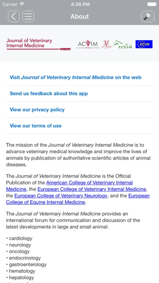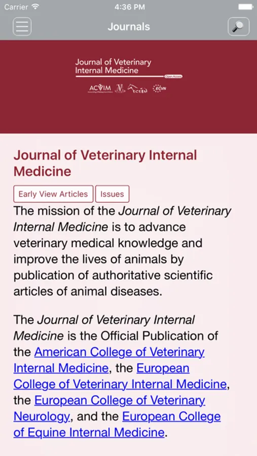 • Share links to relevant research and news with colleagues and friendsThe Journal of Veterinary Internal Medicine (JVIM) is the official Publication of the American College of Veterinary Internal Medicine (ACVIM), the European College of Veterinary Internal Medicine (ECVIM), the European College of Veterinary Neurology (ECVN), and the European College of Equine Internal Medicine (ECEIM).