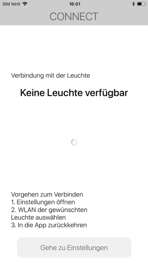 The connection to the luminaire is established via WiFi and requires a stable WLAN connection. The security check means that it can take up to 45 seconds for a stable connection to be made. A successful connection is indicated by the WLAN symbol in the iOS status bar.