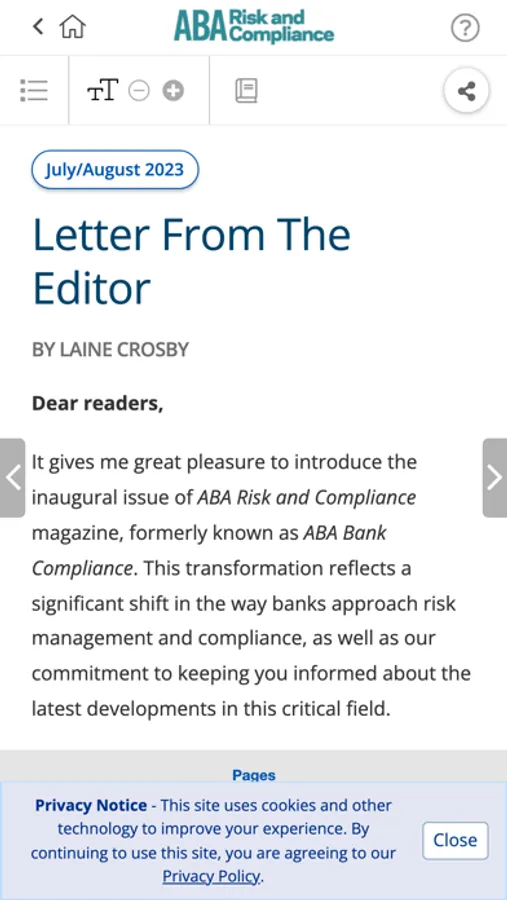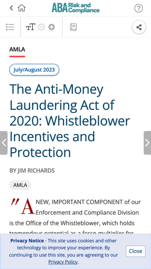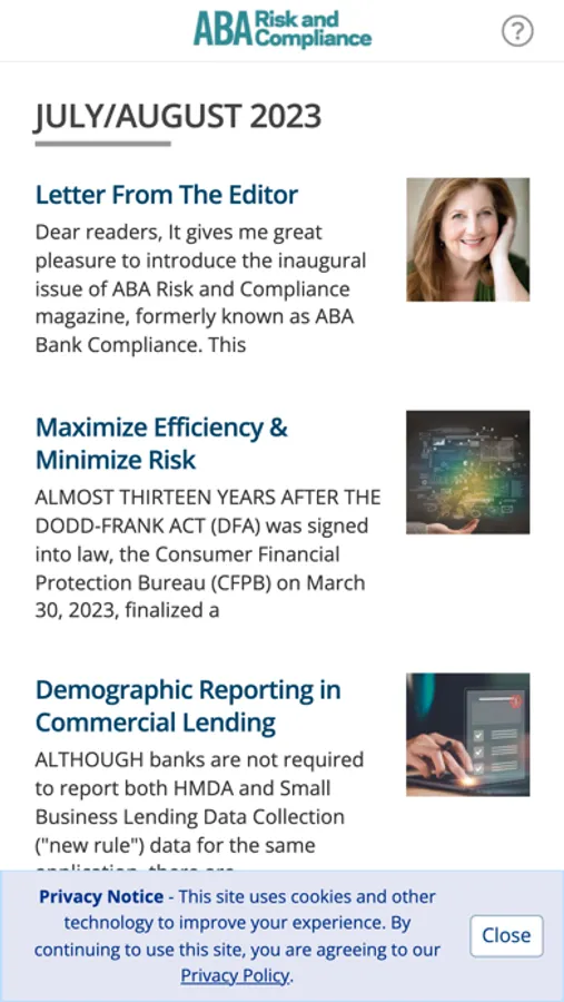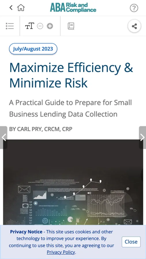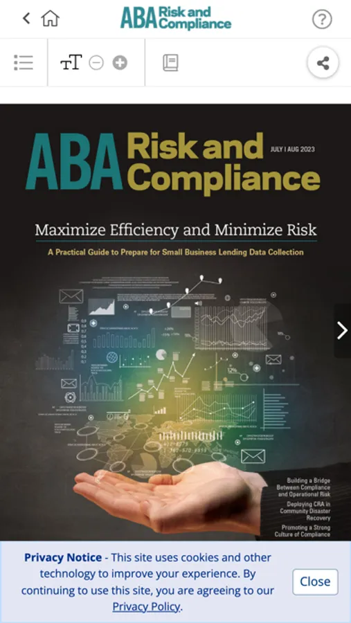 ABA Risk and Compliance magazine provides you with award-wining analysis of legislation, regulation and case law on a bimonthly basis. It is packed with useable, turnkey procedures, insightful sidebars and ready-to-use sample charts and forms.