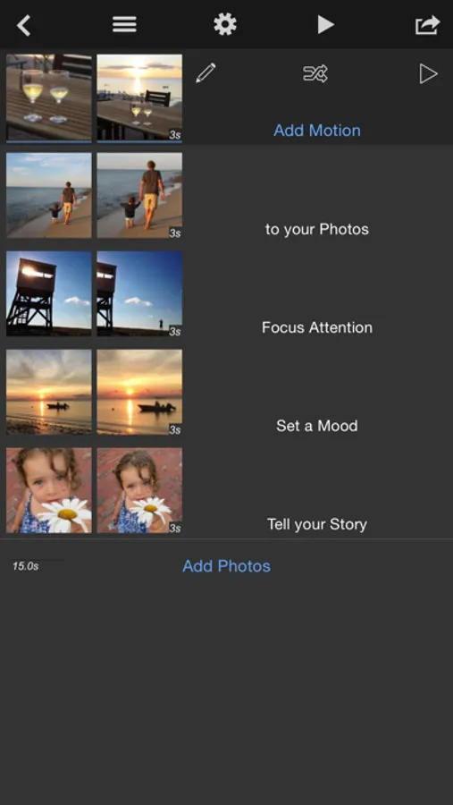 PhotoMotion turns your photos into an immersive video with motion, titles and music. Focus attention, set a mood and tell a story using a photo animation technique made popular by documentary creator Ken Burns.