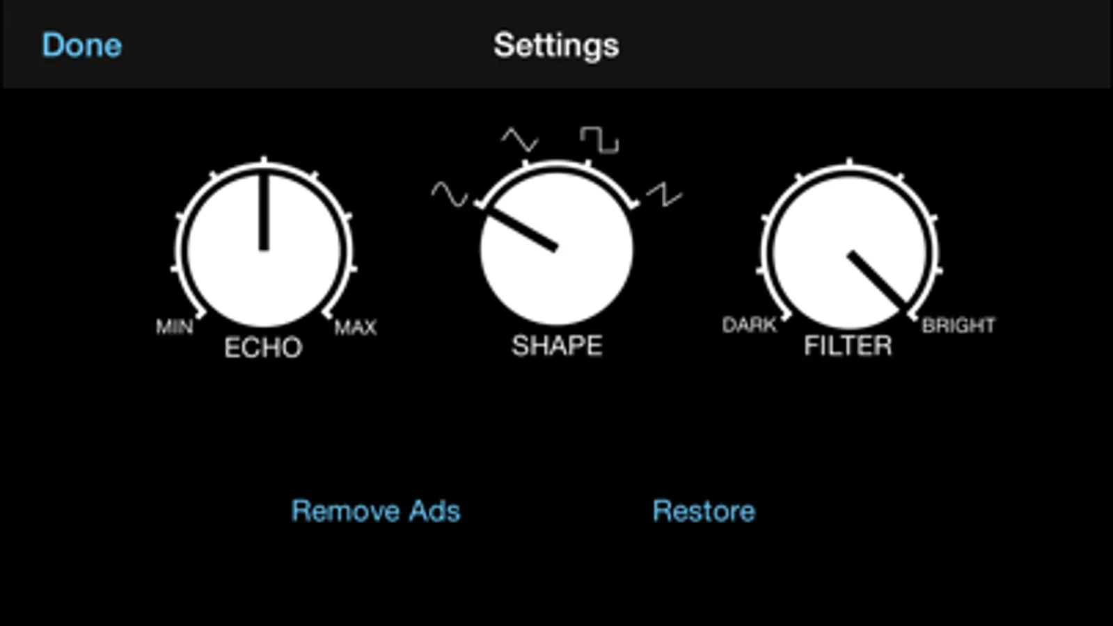 The Nebulous Theremin Synthesizer has been designed to re-create the classic sounds of a theremin, adapted for iOS devices. Touching the screen produces a tone. Moving to the right increases the pitch, and moving up increases the volume. Press the settings button to access additional settings such as echo, filter, and waveform types.