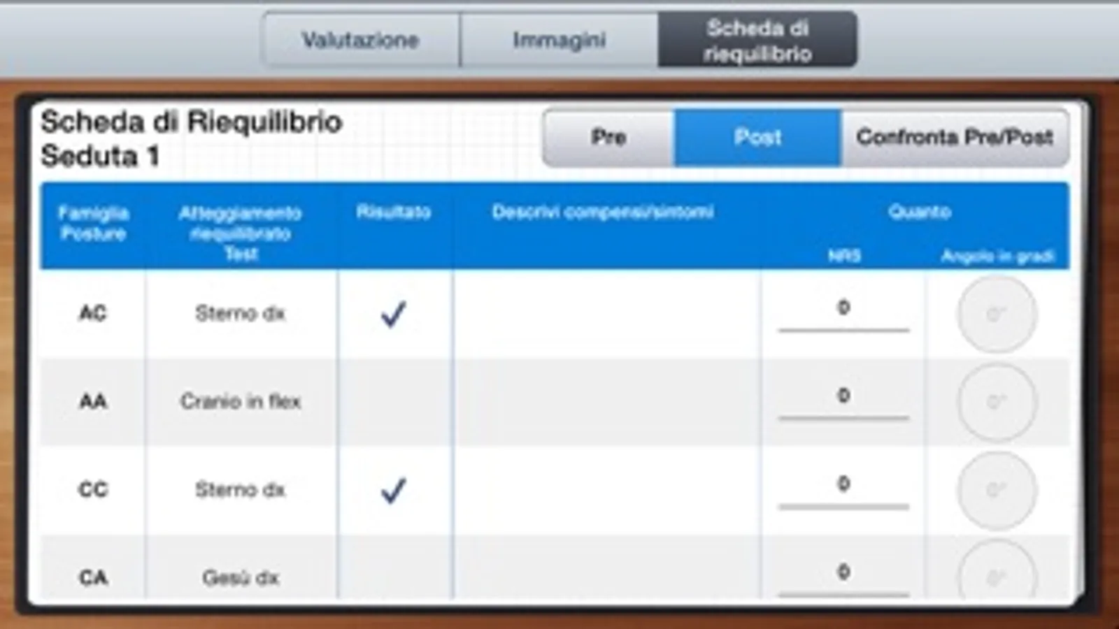 Selecting the Rebalancing column the card named "Pre" opens where the balancing test results can be entered, along with the pain values to be set with the pain scale NRS (numerical rating scale) and the value of the articular angle of compensation.