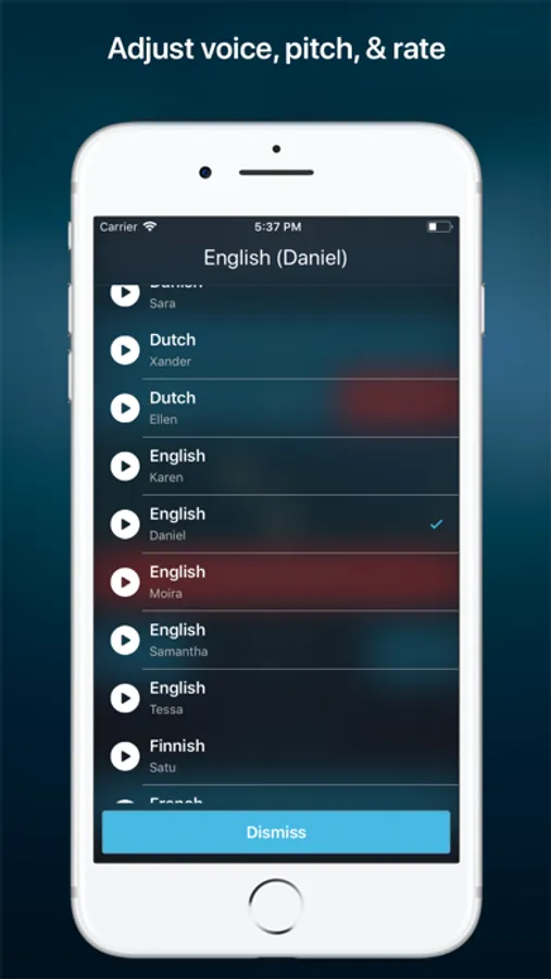 • Sliders to adjust the Volume, Pitch and Rate of the voice.