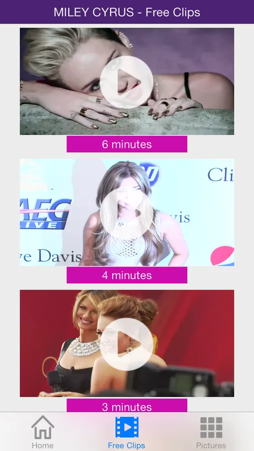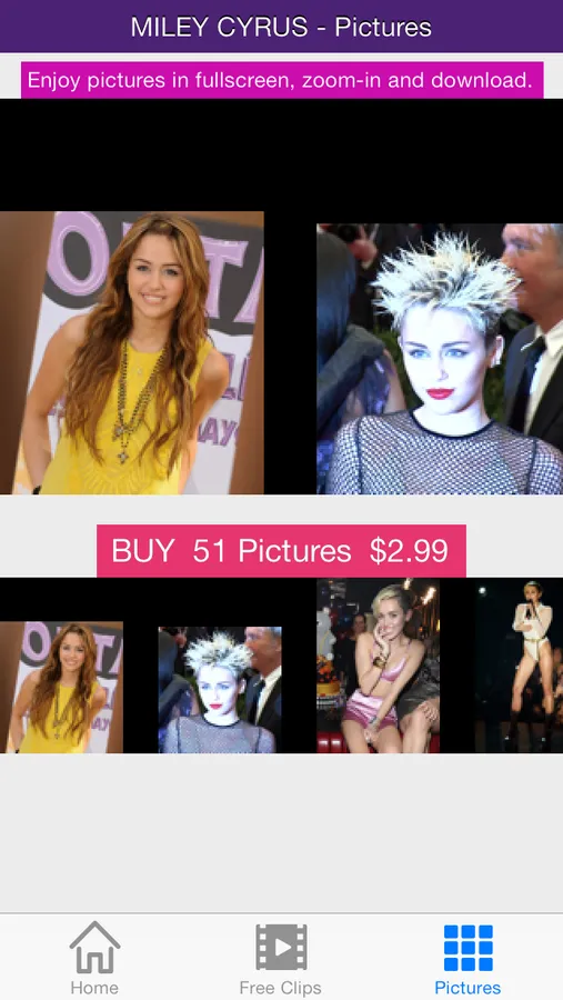 Also included are more than 30 minutes clips of her free music videos, which are advertising supported. Further, enjoy 51 high-resolution pictures of Miley Cyrus. You may copy these images to your device. Please note that both options - stream and/or download, require high speed Internet connection, i.e. Wi-Fi. We do not support any streaming or downloading of videos over 3G network.