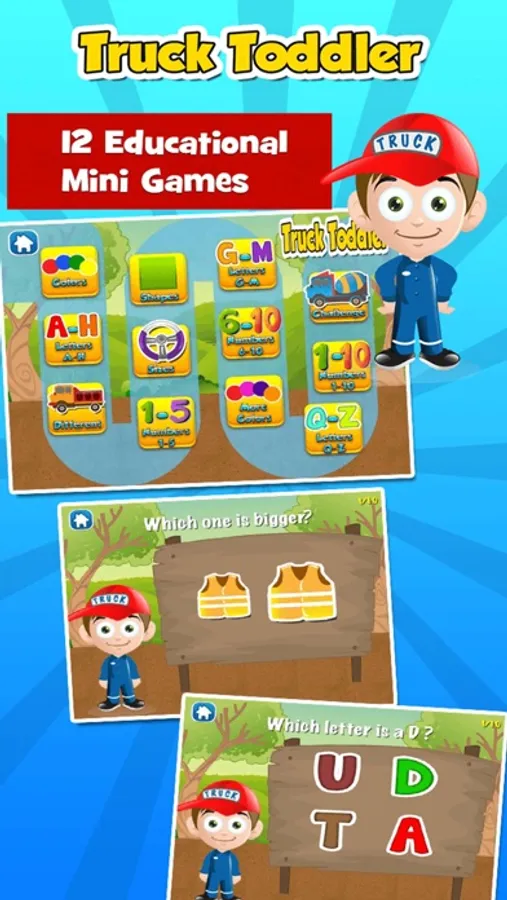 This app teaches your toddler letters of the Alphabet or your ABC, shapes game, the color games, numbers, sizes, and spot the different games, all using toy truck graphics and cartoon animations.