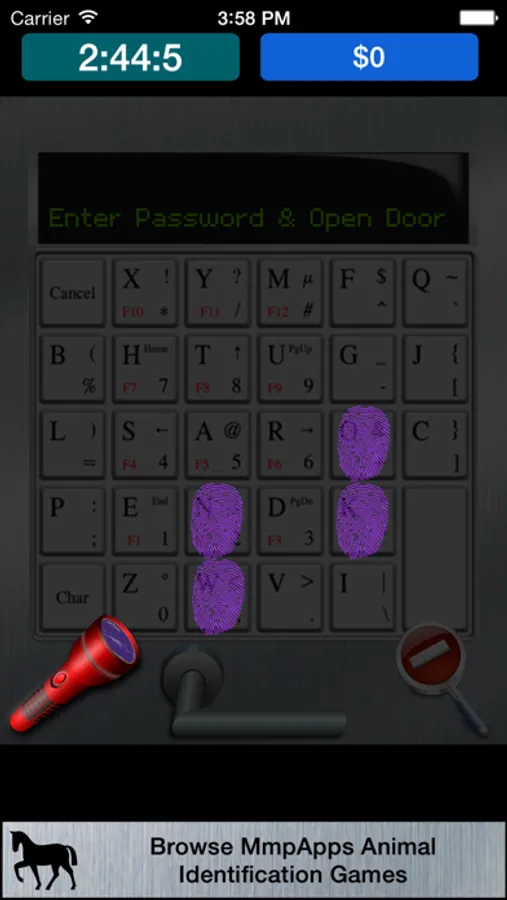 You are in a bank vault and have three minutes to open as many deposit boxes as you can. Using your Black Light you can reveal the fingerprints on the keypads - now decode the password.