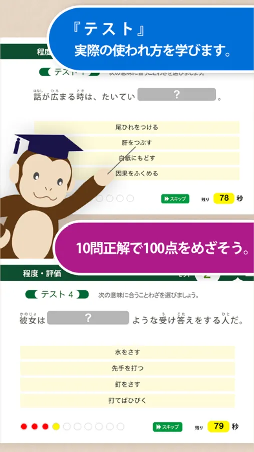 ・テストモードは、練習で学んだ慣用句を、実際の用例を用いて正しい使い方ができるかを試します。