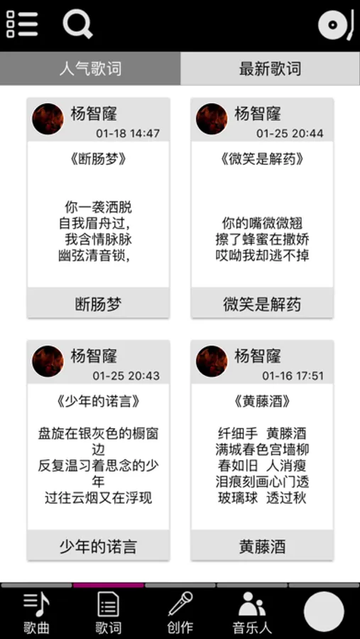 “唱作网”给热爱音乐创作的您提供从音乐创作、编曲到音乐发布的一站式音乐服务。如果您是一位资深音乐人,它可以给您带来创作灵感,并提高您的创作效率;如果您是音乐初学者,它可以帮您快速入门,并助您在短时间内创作出自己想要的音乐;或者您是一位才华横溢的诗人,您可以在这里向其他唱作达人们分享您华丽的歌词。