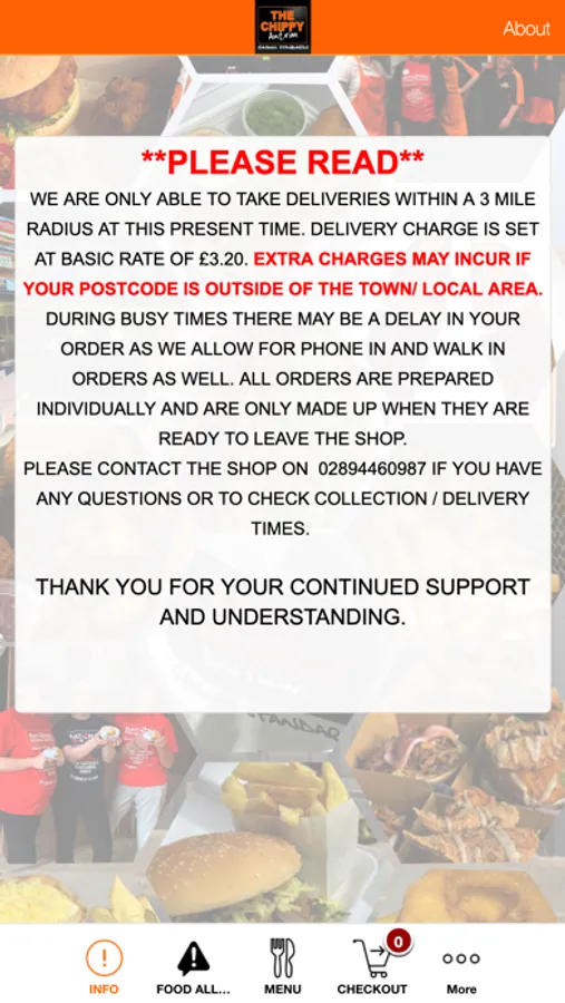We offer a range of food including Fish & Chips, Freshly battered Cod, Chicken Spacers, Sausages, Burgers,Pasties, Chicken Goujons and much more....