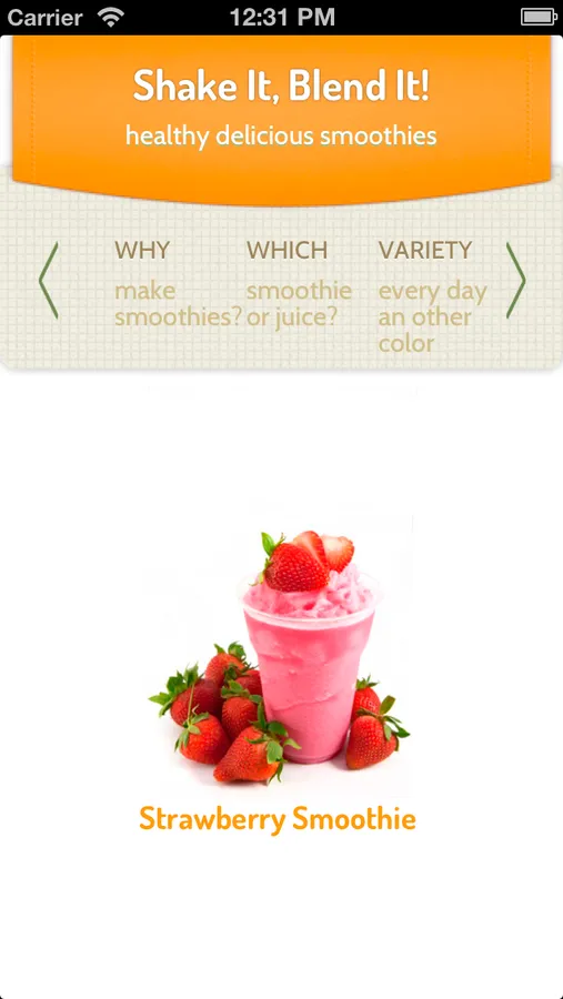 Sometimes it is difficult to choose a smoothie from the wide selection. Therefore, the app helps you, by letting you choose a smoothie in several ways: