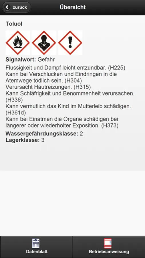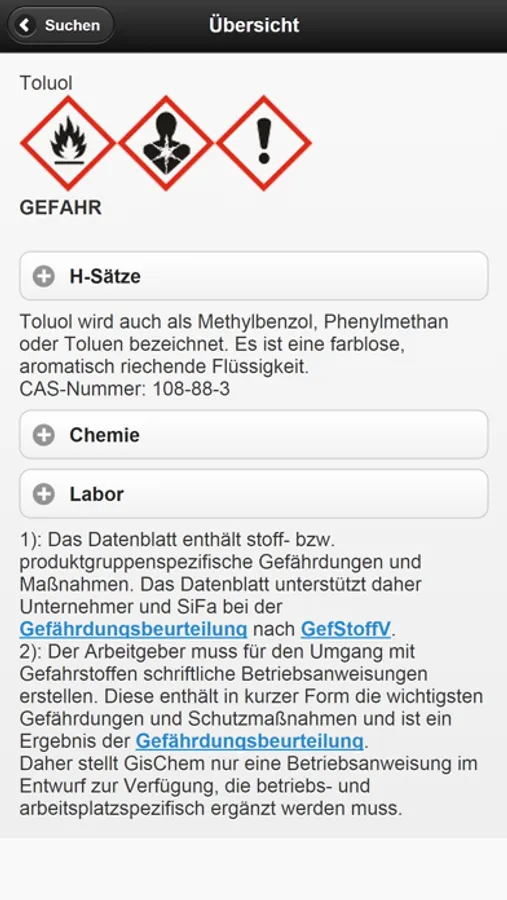 GisChem enthält Datenblätter mit zahlreichen Informationen zum sicheren Umgang mit Gefahrstoffen am Arbeitsplatz. Neben den Gefährdungen werden Schutzmaßnahmen (z.B. Technische und Organisatorische Maßnahmen, Persönliche Schutzmaßnahmen, Brand- und Explosionsschutz) beschrieben und Hinweise z. B. zu den Themen Lagerung und Entsorgung gegeben. Zu jedem Gefahrstoff gibt es auch einen Betriebsanweisungsentwurf zur Information der Beschäftigten.