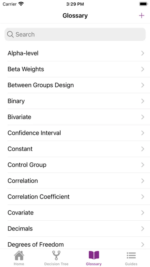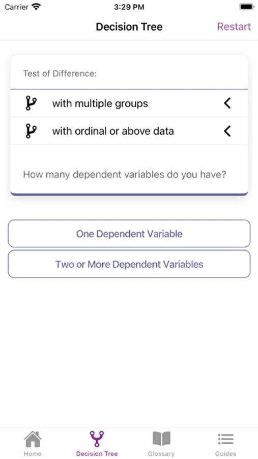 The main feature is the decision tree, this allows users to answer a series of questions about their data and discover the most appropriate test. Each test covered features a basic overview plus guides, using a practical example, on how to input data and run the analysis, what to look for in the output (interpretation) and an example write-up. There is also a searchable glossary, covering the most common statistical terms used in the social sciences.