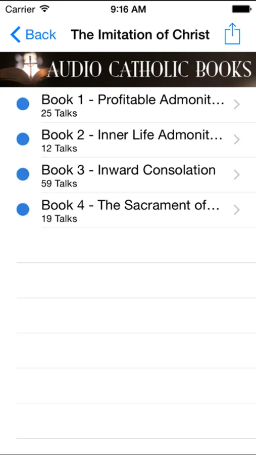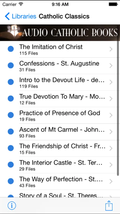 These five (5) classics are a must-read for every Catholic Christian, and you can listen to all 5 for less than the price of one book. Within the app, you will find a list of many other great Catholic audio books for in-app purchase, including ‘St. Anthony the Wonder Worker of Padua’, ‘The Cure of Ars, the Man Who Fought with the Devil’ on the life of St. John Vianney, ‘Utopia’ by St. Thomas More, ‘Kindness’ by Fr. Frederick Faber, ‘Faith of Our Fathers’ by Fr. James Gibbons, ‘Why Must I Suffer?’ by Fr. F.J. Remler, ‘God’s Troubadour’ about the life of St. Francis of Assisi, ‘Sin and Its Consequences’ by Henry Cardinal Manning, ‘On Loving God’ by St. Bernard of Clairvaux, "Prayer: Its Necessity" by Fr. Ferreol Girardey, 'Confessions' by St. Augustine, 'Intro to the Devout Life' by de Sales, 'True Devotion to Mary' by Montfort, 'The Way of Perfection' by St. Teresa, 'Story of a Soul' by St. Therese of Lisieux, and a life of St. Vincent de Paul and St. Joan of Arc. More books will be added in future updates.
